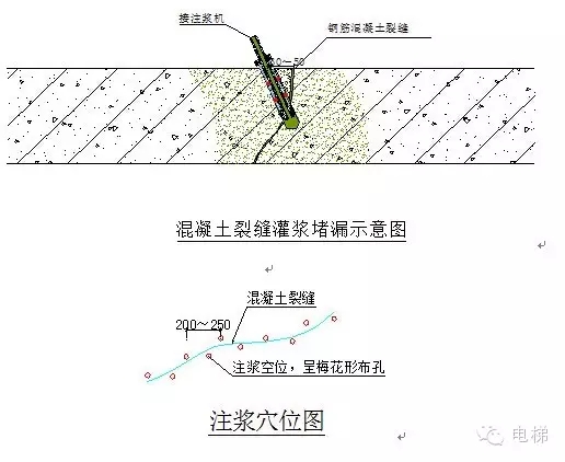 ??(2)布孔:施工操作人員從電梯井基坑的一測開始逐處查找漏點,并用紅色噴霧式油漆標明。標示的方法根據(jù)滲漏部位的不同確定,大面積的滲漏采用密集的紅點標示,裂縫滲漏采用紅×標示,一般是沿著裂縫的走向每隔250px兩邊交替標記,單個的滲水點采用紅色的○標示;