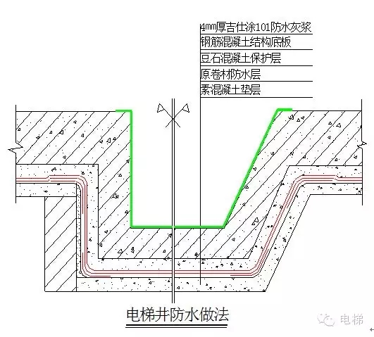 ??(1)因底板先做防水層,再現(xiàn)澆側壁混凝土墻,這樣導致電梯井側壁混凝土墻跟底板斷層。原施工防水層就沒有起到應有的防水效果,這樣地下水就會不斷從斷層處滲漏進電梯井內(nèi)。
